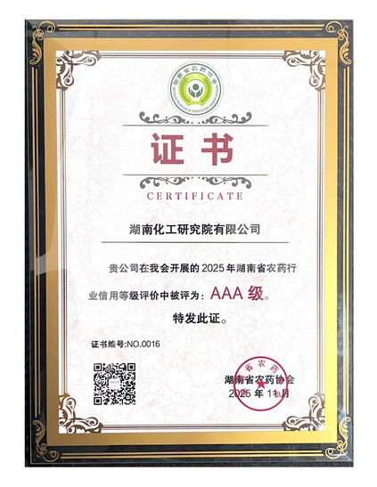 湖南省农药行业信用等级评价每两年开展一次,从经营状况、信用记录、社会责任等多维度对企业综合考评,是行业内最具公信力的信用资质认证之一。此次湖南化工研究院获评AAA级,不仅是企业综合实力的体现,更彰显了其在推动湖南农药产业高质量发展中的带动作用。